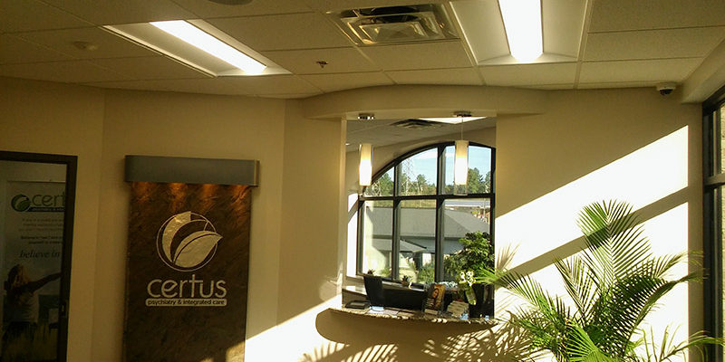 The pictures are from a medical office upfit we completed Certus Psychiatry & Integrated Care in Winston Salem. Their waiting room has a water feature and LED Lighting with modern style pendant at the check in area. The conference room also includes LED lighting and Dimmable LED can lights for different levels to service their meeting room needs. The overall modern style and set up in this local facility is appealing to the new age of the medical facilities in this type of field. Located at Shoppes at Little Creek off Hanes Mall Blvd.